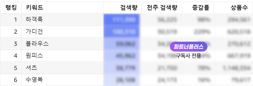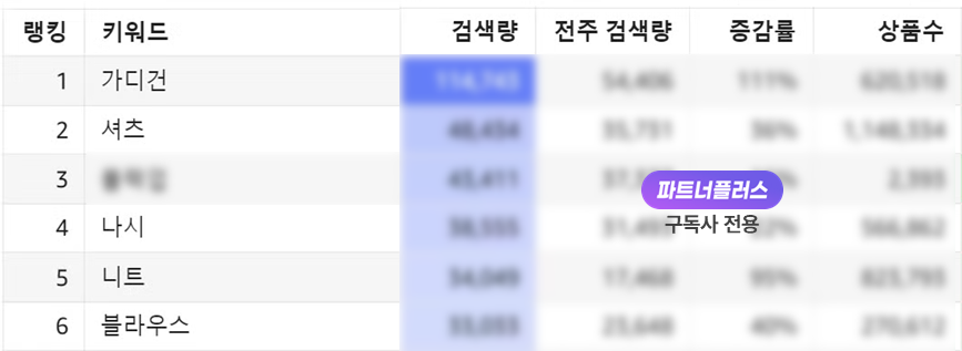 - 키워드 별 세부 지표는 ‘파트너플러스’ 서비스 구독을 통해 확인이 가능합니다.