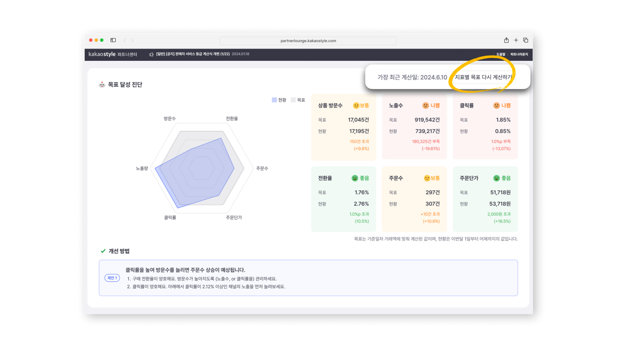 지표별 목표 다시 계산하기 버튼을 누르면 실시간 판매 성과를 기반으로 지표별 달성률이 재산출돼요.100원으로 부담 없이 시작해 보세요 🪙