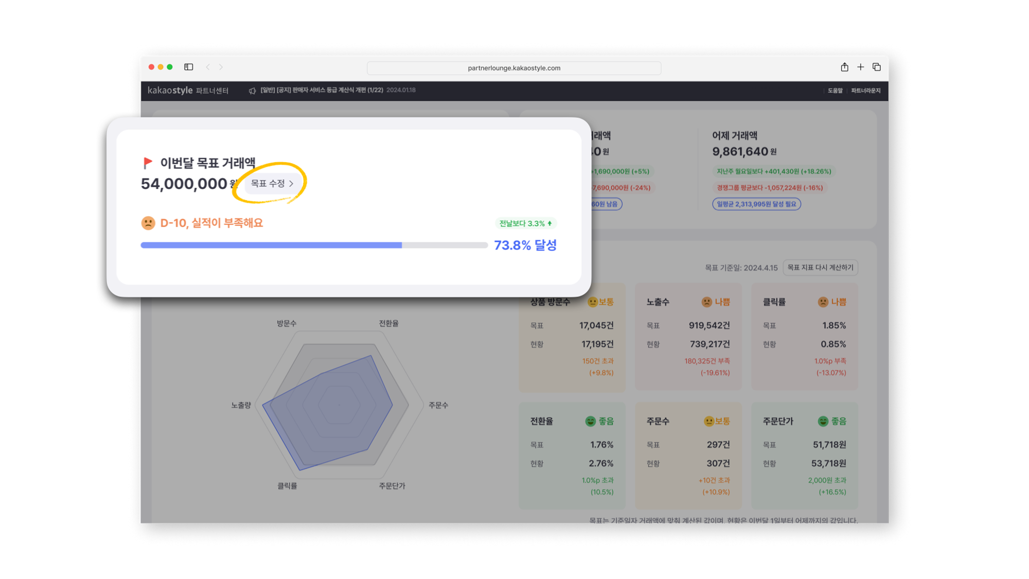 지그재그 빅데이터 기반 분석 솔루션 ‘파트너플러스 인사이트’ 핵심 기능으로 이번 달 목표 거래액을 설정하면 그에 맞는 세부 지표 (상품 노출수, 클릭률 등)의 달성 현황을 확인하며 관리할 수 있는 메뉴입니다.